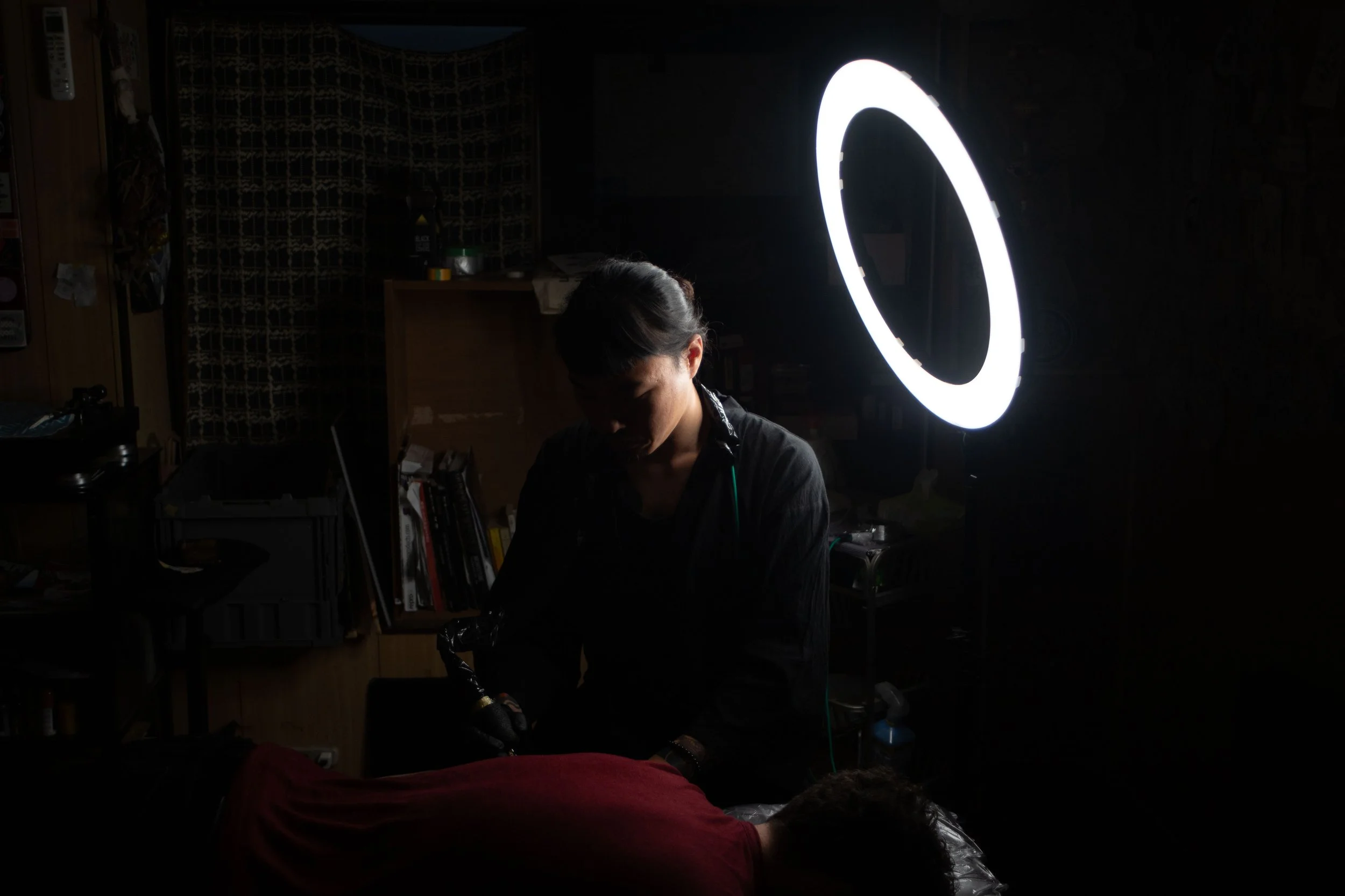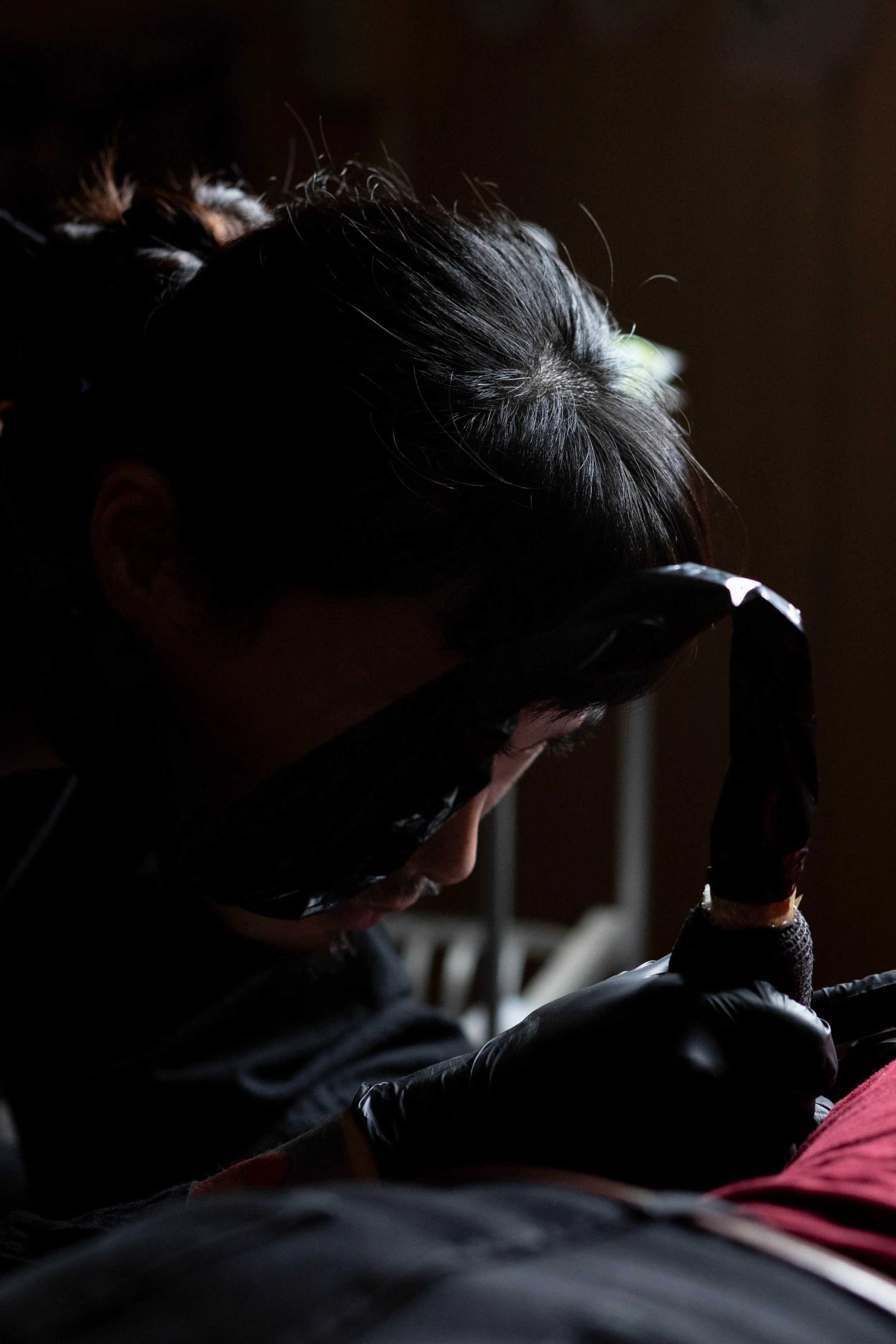 For this session, Føø requested to keep his identity private, so we used the ambient lighting and intimate atmosphere of his studio to create dark, moody portraits that reflect his unique style. A traditional Japanese mask adds a mysterious element, highlighting the intricate details of his work while preserving his anonymity. This series offers a rare glimpse into Tokyo’s tattoo scene, combining artistry and storytelling in a way that celebrates both Føø’s vision and cultural roots.